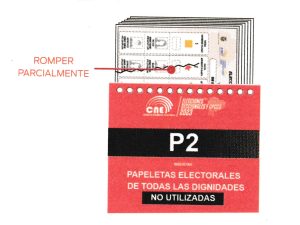 1. Tome las papeletas no utilizadas de todas las dignidades, las rompe parcialmente y las guarda en el sobre rojo P2. Coloque el candado plástico de seguridad y guarde el sobre en el paquete electoral.