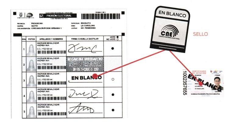 3. El secretario coloca el sello «EN BLANCO» en los espacios sin firmas ni huellas dactilares del padrón electoral y en los certificados de votación no utilizados.