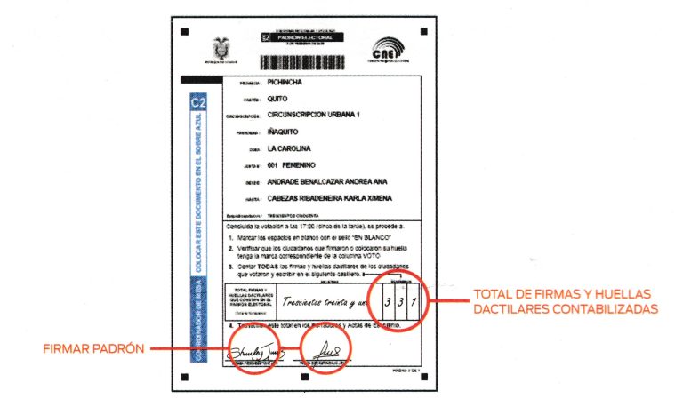 6. El secretario cuenta las firmas y huellas dactilares que constan en el padrón electoral, incluidas las firmas de policías y militares; y, escribe el total en números y letras en los casilleros correspondientes en la carátula del mismo. El presidente y el secretario firman en la parte inferior de la carátula del padrón electoral.