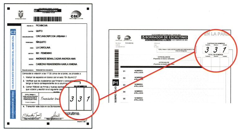7. El secretario compara el total de firmas y huellas del padrón electoral con el total de papeletas de la dignidad a escrutar, si no son iguales se procede de la siguiente manera: